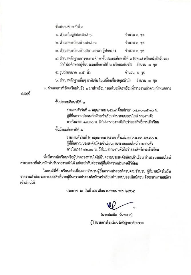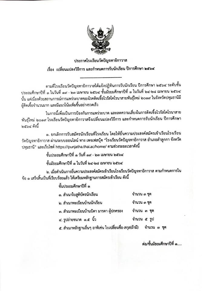 ประกาศ เรื่องการเปลี่ยนแปลงวิธีการและกำหนดการรับนักเรียน ปีการศึกษา 2564